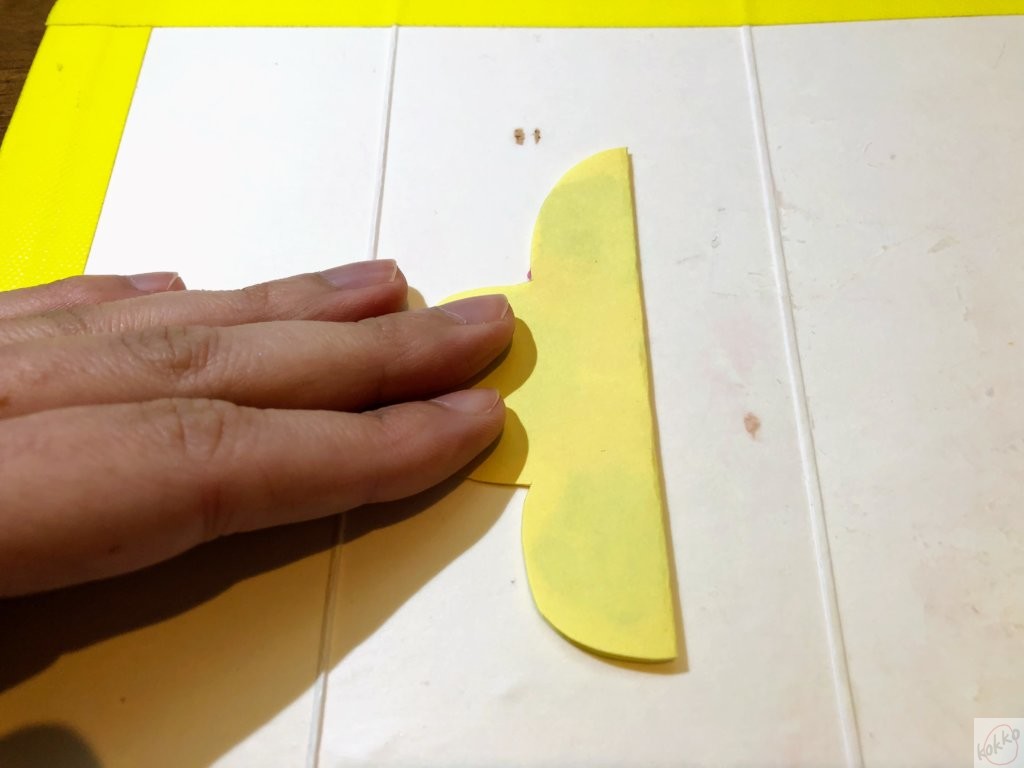 ✔デカルコマニーでは絵の具の濃さがとても重要。いろいろ試してみましょう。今回こっこ先生は、このくらいかなり濃いめでしてみました。(混色の際にちょっと水を足す程度←ただし絵の具の量によって変わります)
